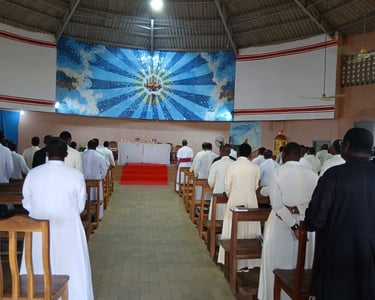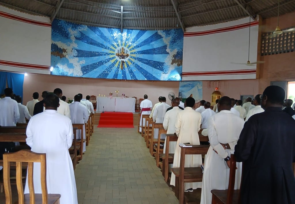 Les prêtres du diocèse de porto novo en adoration eucharistique au sanctuaire de la croix glorieuse de Gbodjè lors de leur recollection préparatoire à l'entrée dans le temps liturgique de l'Avent ce 25 Novembre 2025